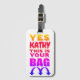A funny and useful luggage tag with big, bold lettering and wild colors you'll see from far away!