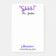 Funny Personalized Shhh! School Librarian Quote Post It Note Pad. Watercolor brushstroke purple lettering says "Shhh!" in quotes. Personalize with Librarian's name and name of school. Librarian written in pretty purple and blue watercolor styling brushstrokes. Modern and trendy gift ideas for school librarians. Be quiet library humor gift for your favorite librarian. Custom Post-it notes for Librarians.