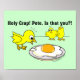 Holy Crap! Pete, is that you? Funny chick cartoon design. Great for humor or vegetarians / vegans. Little chicken chicks are freaked out seeing an egg in a plate.