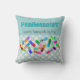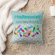 Funny Pharmacist Pillow "Counts Happy Pills by Five", artist drawn colorful capsules with smiley faces on a light blue polka dot and blue background. Great PharmD graduation gift.