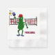 Fun primitive art style pickle holding pickleball paddle and playing pickleball with net.