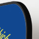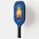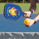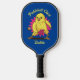 Personalize this fun women's pickleball paddle with your name showing a whimsical bright yellow chick wielding a pickleball paddle along with a feminine hot pink sunburst in the background. A contrasting royal blue background makes the design pop with style.