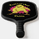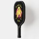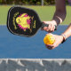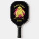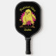 Personalize this fun women's pickleball paddle with your name showing a whimsical bright yellow chick wielding a pickleball paddle along with a feminine hot pink sunburst in the background. A contrasting black background makes the design pop with style. Personalize with your name.