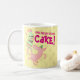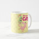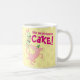 A happy pig on a mug. Use "Personalize this template" to tweak the "Coffee, your daily excuse for CAKE!" text and create a unique, customized gift; text changes are reflected on both sides. A mug for a cake and coffee lover, featuring a gleeful pig, beneath a teetering layer cake with lashings of green icing and topped with pink candles.