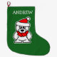 Funny Santa polar bear large Christmas stocking for kids. Cute green and red animal cartoon design for children. Add your own personalized name. Fun xmas party decorations and accessories for boys and girls. Holiday fun.