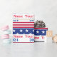 This funny, patriotic, American flag style wrapping paper features a sample name with the election year "2024" printed in blue and the name enlarged and printed in red. You can personalize the wrapping paper to include your own custom name or text. A band of white stars over a dark blue background appear above the slogan and a band of red and white stripes appear below the slogan. The patterns and colors on the wrapping paper represent the American flag.