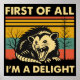 funny possum design, opossum humor, sarcastic animal quote, vintage retro possum, first of all I’m a delight, funny wildlife art, cute opossum illustration, retro animal lover gift, vintage sunset design, funny animal gift, sarcastic gift idea, opossum shirt, possum mug, possum tote bag, quirky animal humor, funny quote design, animal sarcasm, retro humor apparel, funny wildlife lover gift, cute possum joke, opossum lover gift, sarcastic opossum art, possum retro print, wildlife humor, funny forest animal, cute marsupial design, hilarious animal saying, introvert humor, sassy quote design, vintage humor decor
