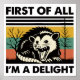funny possum design, opossum humor, sarcastic animal quote, vintage retro possum, first of all I’m a delight, funny wildlife art, cute opossum illustration, retro animal lover gift, vintage sunset design, funny animal gift, sarcastic gift idea, opossum shirt, possum mug, possum tote bag, quirky animal humor, funny quote design, animal sarcasm, retro humor apparel, funny wildlife lover gift, cute possum joke, opossum lover gift, sarcastic opossum art, possum retro print, wildlife humor, funny forest animal, cute marsupial design, hilarious animal saying, introvert humor, sassy quote design, vintage humor decor