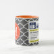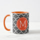 Funny Prescription Hot Tea Mugs. Write your own prescription! Add your name, your doctor, your favorite tea and even your own instructions! Make if funny, make it yours! Custom Monogram! Featuring a beautiful Dark Grey Moroccan Quatrefoil pattern. Orange circle with white monogram.