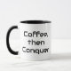 Get your inspirational, motivational mug with a coffee pun, 'coffee then conquer' twist now!