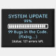 Add a dose of tech humor to your space with this “System Update” magnet. Featuring a progress bar stuck at 99% alongside the cheeky message about 99 bugs in the code, this design perfectly captures the never-ending cycle of fixing one problem only to discover even more—now with 127 errors to go! Perfect for programmers, IT professionals, teachers, or anyone who appreciates a good debugging joke, this magnet brings personality to your fridge, filing cabinet, or workspace. It’s a fun reminder that sometimes progress isn’t always as smooth as it seems.