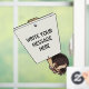 A window cling featuring a grumpy cartoon hedgehog holding a placard with a message for the world; he might be campaigning, protesting or advertising, it's up to you. Change the text to your preferred message; on a window near your front door this might be a message for visitors or instruction to the postman or delivery driver. Examples: "Beware of the dog!", "No cold callers!", "Deliveries to back entrance" etc.