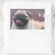 Cute, funny fawn colored pug dog is having a birthday party with a cake in the background and a big happy grin on his face dog lovers birthday party sticker