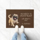 "No need to knock twice, We have a Pug" declares this funny door mat. The text is in tan at the right side, while an image of an adorable little Pug dog is at the left. Everything is placed on a brown background.
