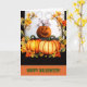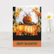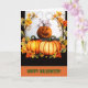 A funny pumpkin surrounded by leaves and fall flowers Halloween greeting card.