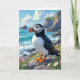 A funny puffin pun birthday. A beautiful vibrant colorful ai illustration of a puffing watching the ocean waves by the sea shore surrounded by rocks, dunes and flowers.