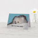 Bright mod aqua blue stripes surround a cute white Pomeranian puppy who's asking: You're how old? Inside text says: Have a Happy Birthday anyway!. All text is customizable. © Little Wing Photography & Design