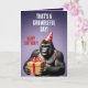 A funny design featuring a silver back gorilla holding a gift, what a hilarious way to wish happy birthday to a friend or loved one!