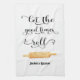 Black and White Kitchen Towel with Funny Quote Let the Good Times Roll in Typography and rolling pin illustration. Personalize with your own text. Housewarming Gift, New Home Gift.