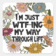 Funny life quote "I'm just WTF-ing my way through life" with black text and a daisy floral wreath.