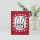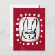 A cute drawn rabbit in black and white over a red textured background surrounded with white dots.