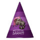 A funny raccoon on paper party hats. Use "Personalize this template" to change the "HAPPY BIRTHDAY SARAH!" name and text for a unique customized party accessory. Paper hats provide a coordinated touch for a birthday party, featuring my cartoon of a cute raccoon eating a chocolate birthday cake. Brighten up your birthday celebration with this original artwork.