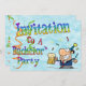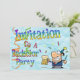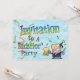 Crumpled light blue paper as a background with wordart in rainbow colors decorated with paper streamers in orange and green inviting the gang to a bachelor party. To top it all there´s a comical cartoon guy wearing a party hat and holding a stein full of beer, with more streamers flying around him. A fun design for a happy occasion.