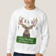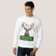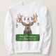 Let's celebrate and have fun with this funny Ugly Christmas Sweater. Design features a drawing reindeer with tangled up Christmas lights in its antlers. Customize Merry Christmas and Happy New Year text areas on a green knitted wool background sign at the bottom.