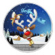A Funny cartoon reindeer with a bright red nose and large white antlers, adorned with a red and gold bow, peeks through an open window. Outside, a snowy landscape with silhouetted pine trees and a small, glowing house is visible under a dark blue, star-filled night sky. Santa's sleigh pulled by reindeer is flying in the distance. The scene evokes a festive and whimsical Christmas atmosphere. Original Vector Art Copyright BluedarkArt TheChameleonArt.