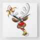 A Funny cartoon reindeer with a bright red nose and large white antlers, adorned with a red and gold bow, peeks through an open window. Outside, a snowy landscape with silhouetted pine trees and a small, glowing house is visible under a dark blue, star-filled night sky. Santa's sleigh pulled by reindeer is flying in the distance. The scene evokes a festive and whimsical Christmas atmosphere. Original Vector Art Copyright BluedarkArt TheChameleonArt.