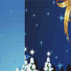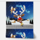 A Funny cartoon reindeer with a bright red nose and large white antlers, adorned with a red and gold bow, peeks through an open window. Outside, a snowy landscape with silhouetted pine trees and a small, glowing house is visible under a dark blue, star-filled night sky. Santa's sleigh pulled by reindeer is flying in the distance. The scene evokes a festive and whimsical Christmas atmosphere. Original Vector Art Copyright BluedarkArt TheChameleonArt.