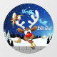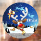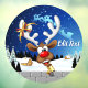 A Funny cartoon reindeer with a bright red nose and large white antlers, adorned with a red and gold bow, peeks through an open window. Outside, a snowy landscape with silhouetted pine trees and a small, glowing house is visible under a dark blue, star-filled night sky. Santa's sleigh pulled by reindeer is flying in the distance. The scene evokes a festive and whimsical Christmas atmosphere. Original Vector Art Copyright BluedarkArt TheChameleonArt.
