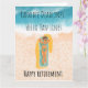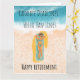 This funny retirement card features a playful, sun-kissed design with a woman sunbathing on a bright, beachy scene. Bold, cheerful lettering reads: