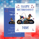 Funny retirement Party Invitation for the retiree. Celebrate the retirement of a family member, friend, or co-worker with this Funny Retirement Party Invitation designed with a caricature old biker. The front page text includes: Happy Retirement Party and the first name in blue on a white background with colorful stars. The reverse side text includes: the name, date, time, location, address and RSVP note on a blue background. To personalize, simply insert your details into our easy template using our step-by-step guide and on-screen tools. Its fast, and easy to do. Enjoy!