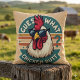 This bold and humorous illustration features a confident rooster rocking a pair of cool sunglasses, set against a retro-style backdrop with warm vintage hues. The classic “Guess What? Chicken Butt” joke is brought to life with a western-meets-80s aesthetic, blending country charm with playful nostalgia. With its distressed, sunset-striped background and bold typography, this design has a rustic yet modern appeal, perfect for those who love farm life humor or quirky animal artwork. The blend of vintage Americana and lighthearted comedy makes it ideal for anyone who enjoys a fun, laid-back aesthetic with a bit of western cowboy attitude. AI generated artwork.
