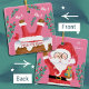 A cute and fun pink Santa Claus reversible ornament with on one side showing him going down the chimney , his feet in the air , under the watchful eye of a cardinal , and the other side he is standing with a jingle bell in one hand and 3 presents in the other . Personalize it with your Holiday greeting , year and family's name .