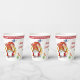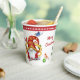 These fun and festive Holiday paper cups feature a big nosed, white bearded, funny little gnome wearing a red and gold Santa Hat embellished with reindeer images. He is getting a bit tangled in the gold ribbon he holds! Two birds perch on him, and another watches from his perch on a green tree bulb. The image is printed twice on the cup, with your custom text in red and green at the center. A red border with white chain decoration finishes the top portion.