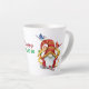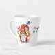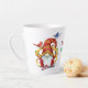 This cute Holiday mug features a big nosed, white bearded, funny little gnome who wears a red and gold Santa Hat embellished with reindeer images. He is getting a bit tangled in the gold ribbon he holds! Two birds, a red cardinal and a blue jay, perch on him. The image is placed on two sides of the mug, with custom text in red and green in the middle that says "Happy HO HO HO". Cute!