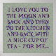 A funny design based on hearts and text, intended for a gay couple. The poster is covered with outlined hearts colored blue, and a larger set of two blue hearts is centered. A massive text is written in playful font: "I LOVE YOU TO THE MOON AND BACK AND THEN TO THE KITCHEN AND BACK WITH A NICE CUP OF TEA - FOR ME...". A pretty sweet and funny quote that can easily be customized. Replace "tea" with "coffee" if that is your... um, cup of tea. Solid blue background color can also be adjusted. Note that if you choose a darker background, the text might need a lighter font color.