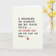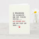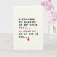 This greeting card keeps the focus on a simple message set on an off-white background. Across the center, it reads “I PROMISE TO ALWAYS BE BY YOUR SIDE...” in black, typewriter-style letters that feel honest and direct. Just below, the tone changes with “OR UNDER YOU OR ON TOP OF YOU...” written in bright red, using the same straightforward lettering. The red lines add a flirty, funny twist to the sweet promise and make the contrast easy to notice. At the end of the message, there’s a small red heart placed right after the last dots, like a little sign-off. It comes across as romantic with a bit of cheekiness, perfect for a partner who likes jokes ❤️💌🍫.