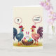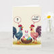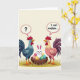 This card shows a funny little scene where two stylized roosters stand on either side of a small white rabbit 🐰, set against a muted beige background with a few green tufts near the ground. The left rooster is blue‑gray with a red comb and orange legs, and its wide eyes and open beak lean toward the rabbit like a friend demanding answers. Above its head, a small question mark appears in a light thought bubble, placed slightly to the upper left. On the right, a peach‑toned rooster with deeper plum tail feathers and a crimson headpiece faces inward, its open beak aimed toward the center as if caught in an awkward, tender moment. Near the upper right, a speech bubble reads “I can explain...” in dark lettering, adding to the flustered, caught‑in‑the‑middle look between the two birds 🐇. The rabbit sits calmly between them with pink cheeks and bright eyes, giving a soft, knowing glance that feels like a secret shared. At the rabbit’s feet, a rustic wooden bowl is filled with speckled egg shapes in rose, golden yellow, and teal.