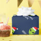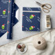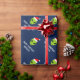 Funny Santa Claus alien Christmas wrapping paper for men women and kids. Green alien head wearing a Santa hat giftwrap personalized with seaspns greeting and name. Funny UFO gift wrap design for Holiday presents. Make one for son, grandson, new baby, grandchild. Extraterrestrial life space cartoon illustration for children (boys / girls) and adults. Custom color background ie blue.
