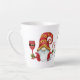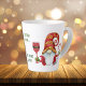On two sides of this Holiday latte mug is a cute gnome elf dressed in a red and gold reindeer pattern Santa hat. He holds a Santa Claus wine glass in one hand, and a red and white striped candy cane in the other. The green text between the images says "COFFEE NOW...BUT WINE LATER".