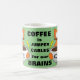 COFFEE is JUMPER CABLES for our BRAINS Cartoon Cat Coffee Mug. This humorous design features cartoon cat Señor Gato holding a giant cup of coffee! Printed in the center are the words COFFEE is JUMPER CABLES for our BRAINS with a lightning bolt on either side! Background color is light green.