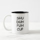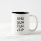 Trendy, stylish, funny coffee mug saying "Shu duh fuh cup" in modern typography on the two-toned coffee mug. Perfect birthday gift for the awesome coworker, buddy, bestie or boy-friend.