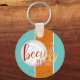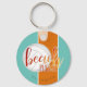 This girls' volleyball keychain with custom name features the fun play-on-words saying "beach please" in colorful sunset ombre typography overlying a white volleyball graphic - background is teal with a wide vertical orange stripe - by katz_d_zynes | part of katzdzynes' Volleyball "beach please" collection >>> https://www.zazzle.com/collections/119616850927081153 and Volleyball Keychains collection >>> https://www.zazzle.com/collections/119042498553482541