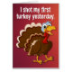 Funny “I Shot My First Turkey” get well card. Trendy halftone dots cover art with a bold, colorful turkey cartoon in shades of red and brown.