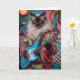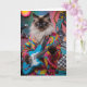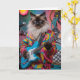 A cute funny cat greeting card featuring a Siamese cat in psychedelic garb playing electric guitar.