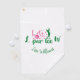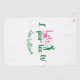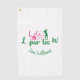 The lady golfer in your life will love keeping her golf equipment clean with this golf towel. It has the phrase 'Let's Par Tee' in green and pink script typography. The 'o' in the word golf is a teed up golf ball. There's also pink hearts, a pink golf ball and a green image of a female golfer swinging a golf club. In green script typography are initials along with a name on the bottom all of which can be edited. Add your first initial on the left, your last initial on the right and your own name on the bottom. All of the colors in this design are editable.