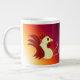 A cool farm animal. A funny rooster sitting down after a hard days work. A shaded background of orange and maroon colors.